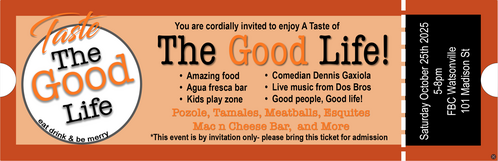Taste The Good Life is free for everyone to attend and is made possible entirely by your generosity. Please consider donating today to fuel the food, music, and fun and help us to share the Good Life we have in Christ.